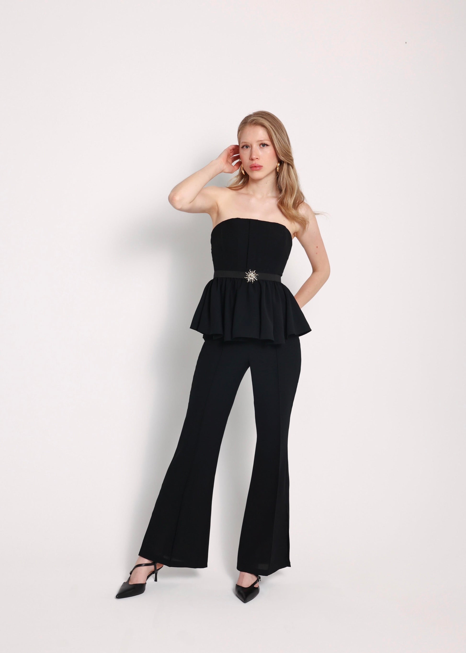 Takım, bir straplez üst ve bir yırtmaç detaylı pantolon olmak üzere iki parçadan oluşmaktadır.
