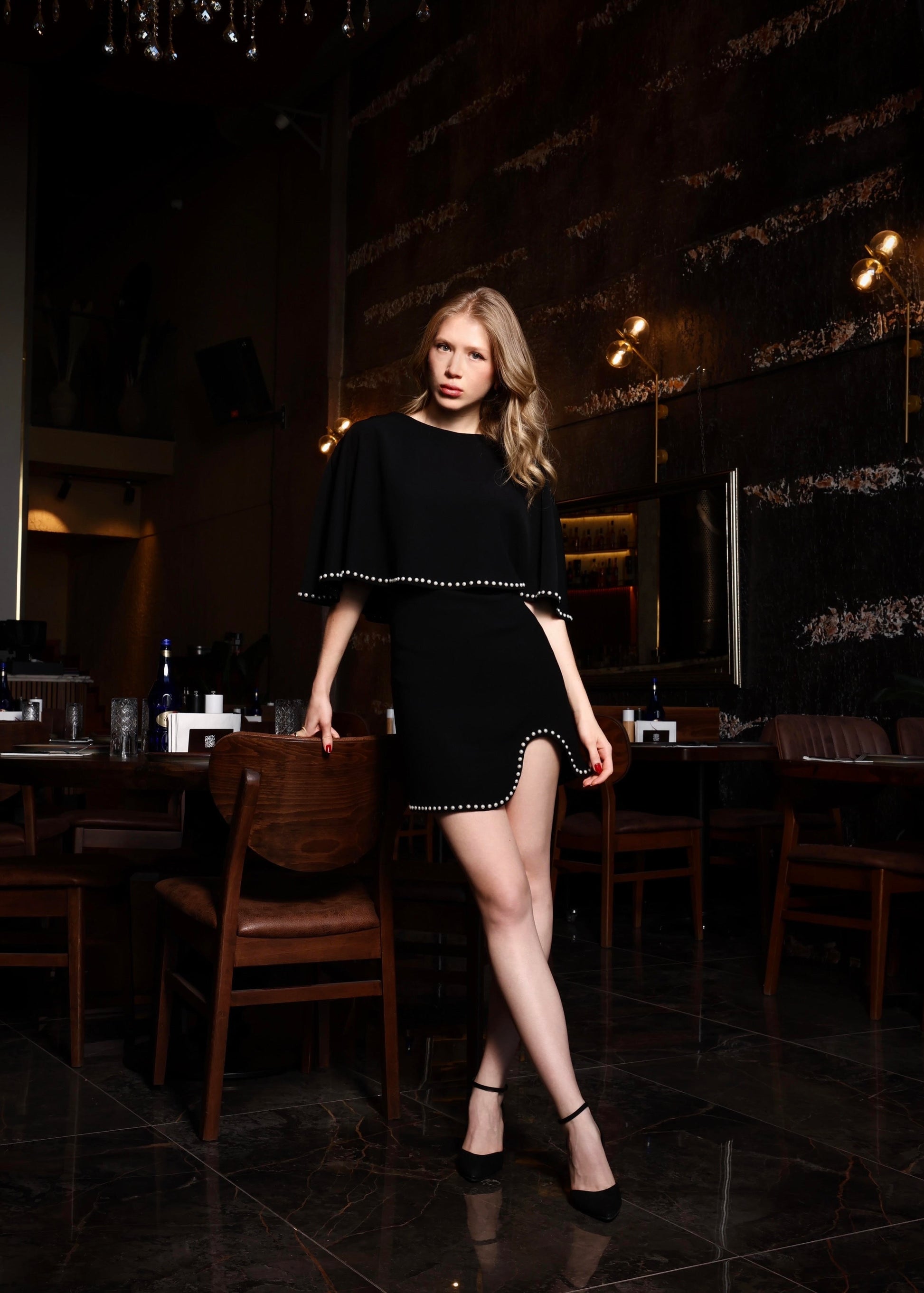 Pelerin ve elbisenin etek uçlarında inci detaylar yer almaktadır.